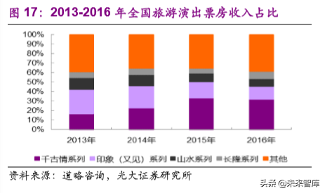 从个体来看,目前千古情系列营收为全国第一,占全国旅游演出营收票房的 30%左右;从区域上来看,形成了长江三角洲、珠江三角洲与西南区域三大旅游演艺圈。