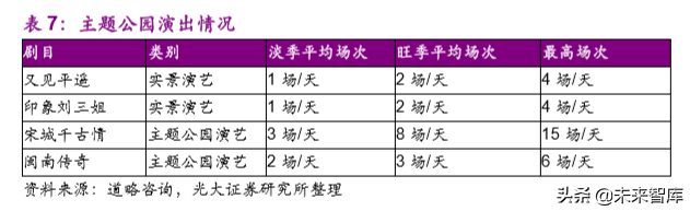 主题公园+演艺一般具有较强的可复制性,一是因像宋城、迪士尼等主题公园,其体验性强为主要特征,演出场景易实现再造。二是创作与运营上大多为一家公司,质量管控能力高,不像实景演艺类项目因需依托当地资源建设开发而导致质量管控能力不高,且开发缓慢。