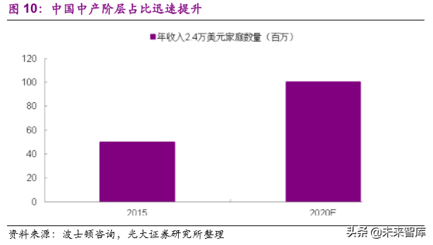 我国中产阶层人群渐渐壮大,根据波士顿咨询数据,到 2020 年,年收入超过 2.4 万美金的上层中产阶层家庭将超过 1 亿。