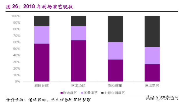 中国剧场演艺市场目前主要特点为区域分散化,表演形式多样。票房前20 台演出中,有 6 台分布在华中,西北、华北及西南均有四台,同一城市中各剧场也较为分散。本身剧场演艺没有像山水演艺与主题公园演艺一样较好的导流场景,过度分散化导致的结果就是整体票房收入偏低,无法形成很好的协同效应。2018年共306台旅游演出剧目,其中剧场演出剧目台数为58%,而演出票房仅占 27%左右。