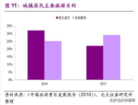 中产阶层崛起下,旅游方式也逐渐发生改变,传统的观光游已难以满足人们的旅行需求,休闲度假和观光旅游并重的局面初步显现。根据中国旅游景区发展报告(2018),无论城市居民还是农村居民,以休闲度假为主的旅游出行占总体旅游出行的比例都有着大幅提升。