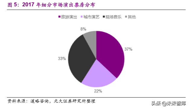 从演出市场角度来看,旅游演艺仍是主要演出市场和主要票房来源,占整体票房收入的 37%。未来演出市场规模发展,也将利好旅游演艺市场发展。