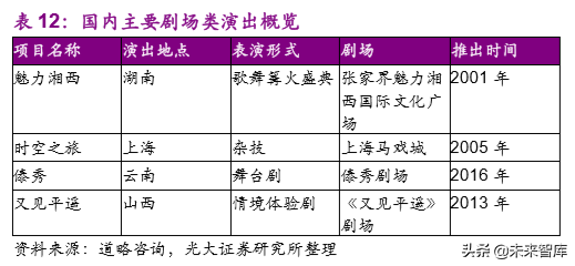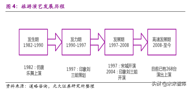 3、发展期:1997 年开始,标志性的时点为 2000 年三个"黄金周"和双休日的实施,深圳的锦绣中华、民俗村等旅游演艺产品共出台 60 多台,宋城开始起步,2004 年首部实景演出《印象刘三姐》开始演出。