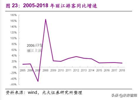 实景演艺基本可以有效弥补当地夜游市场的缺失。2006 年印象.丽江上映,上映后每年客流基本上保持着 15%以上的增长;张家界景区共有多台演艺,其中较著名的《天门狐仙.新刘海砍樵》和《武陵魂.梯玛神歌》分别在2009 年和 2014 年上映,上映后整体客流增速也有明显提升。
