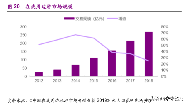 我国周边游规模不断扩大,根据易观发布《中国在线周边旅游市场专题分析 2019》,2018 年中国在线周边游市场交易规模达到 269.70 亿元,相比于 2013 年 41.51 亿的规模,扩大了超过 5 倍。