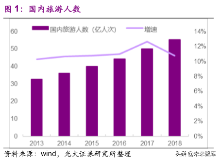 国内旅游人数近年来一直保持着稳健增长趋势,2018 年,国内旅游人数超 55 亿人次,同比增长 10.8%,14-18 年复合增速为 11%。休闲游兴起下,旅游演艺观众人次增速高于整体国内旅游人数增速,2018 年旅游演艺观众人次增幅达 21.3%,14-18 年复合增速达 24%。