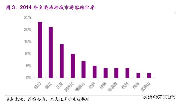 旅游演艺市场高速增长但规模仍然较小,相比目前成熟发达国家,旅游演艺市场转化率仍有大的提升空间。根据道略咨询 2014 年数据,除几个头部城市外,大部分城市转化率不足 4%。2018 年国内旅游演艺市场观众转化率整体由 0.99%提升至 1.51%,变化幅度不明显,而成熟市场如纽约在 2014年观众转化率已达 23%,相比之下中国旅游演艺市场转化率仍有较大提升空间。