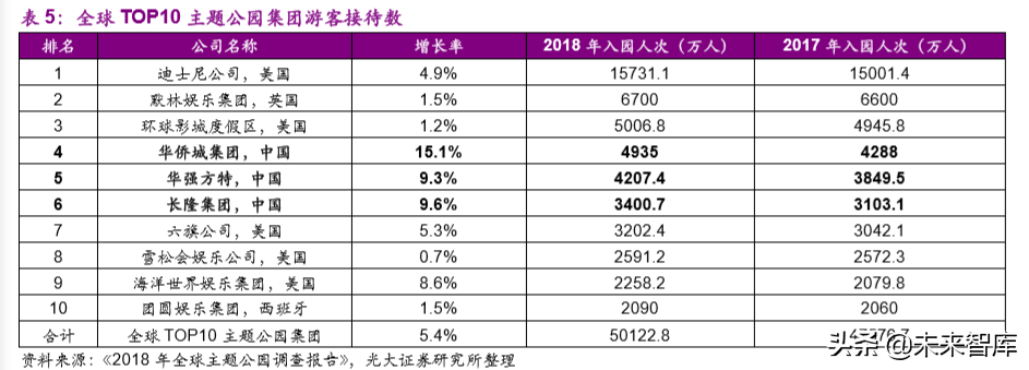 美国主题娱乐协会(TEA)与相关机构联合发布的《2018 年全球主题公园调查报告》指出,2018 年全球前十大主题公园运营商接待游客超过 5 亿人次,整体增长 5.4%,其中前十大主题公园集团中,美国占据 6 席,仍为市场主导。中国数个主题公园集团游客接待量保持高速增长,国内三大主题公园入园人次增速超过 9%,远超其他大型主题公园集团入园人次增速,2018年国内三大主题公园入园人数在全球各大主题公园接待游客总量中已占四分之一。