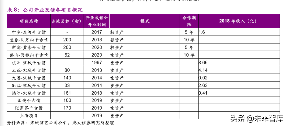公司存量重资产项目有 6 个(杭州宋城、三亚千古情、丽江千古情、九寨千古情(因地震影响暂时停演)、桂林漓江千古情、张家界中华千古情),游客数、营收均实现持续成长;公司在建重资产项目有五个(岭南千古情、西安千古情、澳大利亚传奇王国、上海千古情、西塘演艺小镇项目),将于2019-2021 年陆续开业,长期发展战略明朗;目前已有轻资产项目也将在未来持续运营,第二轮复制扩张、轻资产输出及海外拓展稳步推进。