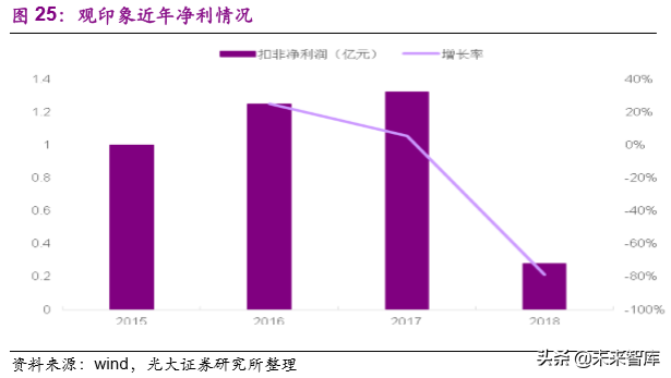 但实景演艺产业上,创作公司因专业性高,护城河明显,毛利率一直保持在较高水平,创作公司以制作收入与票务分成收入为主,分成收入约票房收入的 10%-20%,因投入较少,毛利率大约在 50%-80%。市占率靠前的两大公司为三湘印象子公司观印象与山水盛典。山水盛典创作的项目在全国有20 多台;观印象旗下分"印象"、"又见"、"最忆"三大系列,目前共有11 部公演,2017 年其文化演艺营收 3.49 亿,毛利 2.19 亿。2018 年,因新签约项目数量下降,原有项目未能按原计划完成创作并确认收入,其文化演艺营收为 0.76 亿,毛利 0.42 亿,下滑比较明显。