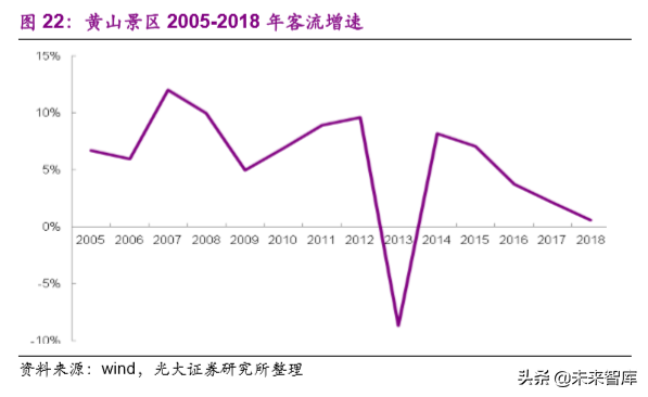 单一型观光景区往往坐落于三四线城市,而夜游项目少,可体验项目不多,休闲化程度不足导致其对游客吸引程度逐渐降低,如山岳景区黄山 2018年客流+0.6%,为近年来新低。