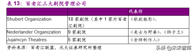 对比国外成功的剧场演出,主要是世界著名的两大艺术集群——百老汇与伦敦西区。百老汇是由 41 家核心剧院所构成,基本由三大剧院管理公司管控,以内容为核心的剧场资源和资本资源整合能力使得百老汇不断壮大乃至如今成为享誉世界的戏剧的代名词。