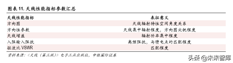 天线是将高频电流或波导形式的能量变换成电磁波并向规定方向发射出去,或把来自一定方向的电 磁波还原为高频电流的一种设备。无线电发射机输出的射频信号功率,通过馈线输送到天线,由天 线以电磁波形式辐射出去。电磁波到达接收地点后,由天线接下来,并通过馈线送到无线电接收机。 可见,天线是发射和接收电磁波的一个重要的无线电设备,没有天线也就没有无线电通信。手机天 线是手机用来接收和发射信号的设备,一般情况下天线长度一般为波长的 1/4~1/2,因此传播频率越 高,天线的长度越短。目前手机中多采用的天线是内置天线。在手机通信技术发展的过程中,随着 通信波段、带宽以及使用技术的不断发展和变化,手机天线也需要做出相应的调整。5G时代,高频 率通信、载波聚合技术带来的信道拓宽、MIMO多天线技术的采用等将会对天线技术产生重要影响。