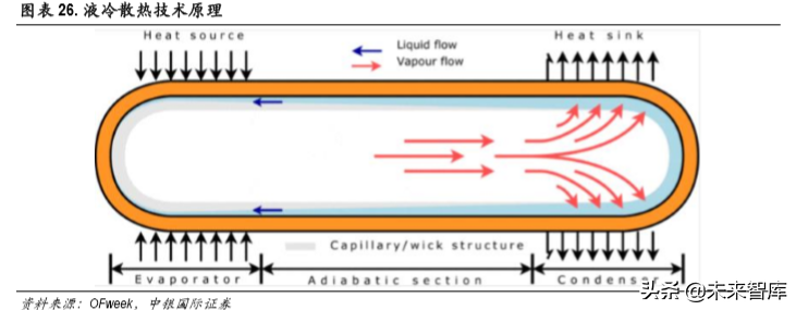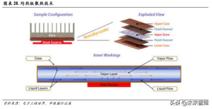 均热板散热:均热板是一个内壁具有毛细结构的真空腔体,腔体充有工质。当热量由热源传导至蒸 发区时,腔体内的液相工质吸收热量在低真空的环境中气化,并向腔体内其他地方扩散,气相工质 接触到比较冷的区域时,便会凝结释放出热量,凝结后的液相工质由于毛细吸附作用再回到蒸发区。 此过程在腔体内不断循环。均热板的结构和原理类似热管,但热管时一维线性传导,而均热板是两 维平面传导。