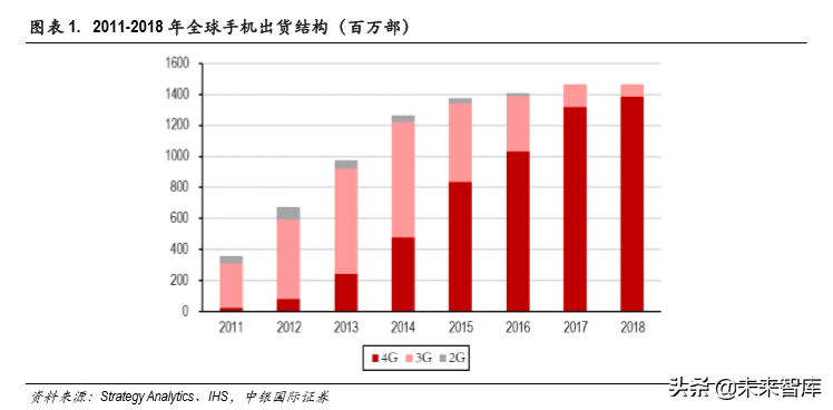 4G手机出货量增长看 5G手机出货量。全球市场看,部分欧洲国家的 4G商用从 2009 年开始。2009年 12月,北欧运营商 TeliaSonera宣布在瑞典斯德哥尔摩和挪威奥斯陆正式商用 4G/LTE 网络。尽管瑞典、挪威等欧洲国家在 2009年就开始 4G网络的商用,但由于终端的缺乏,LTE市场发 展较慢。2010年 12月,美国运营商 Varizon、日本运营商 NTT DoCoMoi启动 4G网络的商用。2011年 7 月,韩国 SKT宣布提供 4G服务。全球首款 4G手机为 HTC在 2010年推出的 HTC EVO 4G,起售价 3460 元。2011年以后,4G手机陆续上市。根据 Strategy Analytics 数据,2011年全球 4G 手机出货量约 670 万部,此后 4G手机渗透率快速提升。到 2015年,4G手机出货量首次超过 3G,渗透率超过 60%。