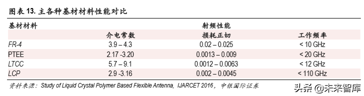 LCP(液晶高分子聚合物)材质具有低介电常数(Dk=2.9)、低介电损耗(Df=0.001-0.002)的特点,在高频 信号传输领域具有较大的优势。苹果在 iPhone X中首次采用了以 LCP作基材的 FPC软板作天线。5G 网络频段较高,LCP天线有望成为 5G手机天线的发展趋势。