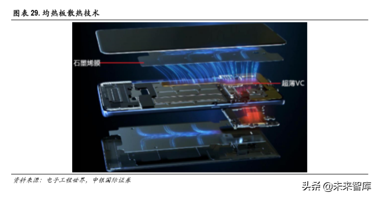 华为 mate20X采用的 HUAWEI SuperCool超强散热系统就是由均热板和石墨烯膜组成。Mate 20 X机身中 嵌入的是目前业界可量产的最薄 VC, 厚度仅有 0.4mm,由 2片铜质盖板内部蚀刻出腔体,在腔体内部 烧结毛细结构和支撑结构,经焊封、填充液态工质后抽真空制成。超薄 VC与处理器等宽,完全覆盖 CPU、GPU等发热核心。