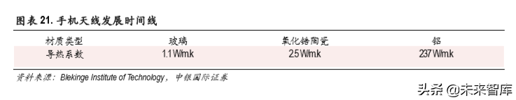 5G手机外观件变化造成散热难度增加。5G由于传输频段较高,为降低介电损耗,后盖材质需要从金 属向非金属转变。金属机壳时代,后盖是重要的热传导路径。由于玻璃等的导热能力远低于金属, 采用玻璃后盖后需要额外的散热设计。