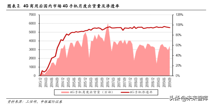 国内市场,2013年 4G商用后,4G手机的渗透率快速提升。2013年 12月,工信部向中国移动、中国 联通和中国电信三大运营商发布 4G牌照,国内 4G正式商用。根据工信部数据,2013年 12月,国内 市场 4G手机出货量 30.8万部,约占当月国内市场手机总出货量的 0.58%。2014年,4G手机渗透率快 速提升,全年出货量达到 1.7亿部,总出货量占比达到 37.9%。到 2015年,4G手机渗透率已经达到 80%以上。