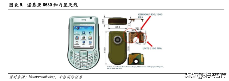 2004 年推出的 3G Nokia6630 手机,可以真正意义上支持全球漫游,是第一个双模三频段手机,可以 支持 GSM900/1800/1900和 UMTS2100,所使用的天线也是多天线内置。