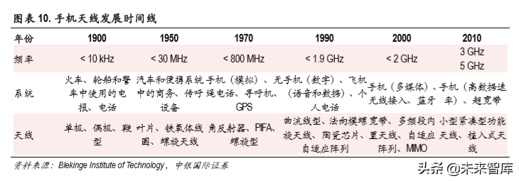 下表给出的是从手机诞生以来的通信频率和对应系统及天线的变化。可以看出手机的通信频率在逐 渐从最初的 kHz发展到目前的 4G系统,达到了 GHz频段,而天线的尺寸也经历了从大到小,从外置 到内置的变化。个人终端的发展趋势是小型化和个人化,而天线为了配合整体设计以及高频段的传 输,也需要做到小型化紧凑化。