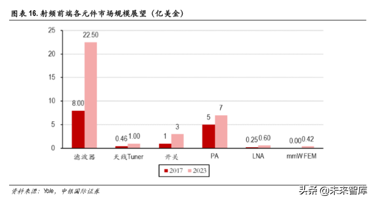 射频前端器件主要包括滤波器、天线调谐器、射频开关、功率放大器、低噪放等。根据 Yole测算, 5G 通信对滤波器的市场规模增长拉动最大,滤波器市场规模有望从 2017年的 8亿美金增长到 2023年的 22.5亿美金,另外,射频开关等市场规模也有望迎来较大增长。