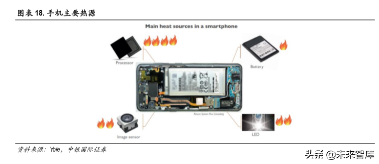 智能手机在使用过程中,处理器、内存、电池等会不断产生热量。处理器、图像传感器、内存等芯 片,以及电池、显示屏 LED背光源等均为手机的发热源。其中,处理器芯片是最大的发热源。过高 的热量会影响手机内部元件的使用寿命和性能,电池过热甚至会产生安全问题。而手机算力的提升, 屏幕清晰度的提高,摄像头像素的提升,以及无线充电等新功能的引入,等均会造成手机发热量的 增大;手机防水性能的升级、外壳从金属外壳向玻璃外壳的演变,造成散热难度增加。因此散热成 为智能手机设计中越来越受关注的问题,散热组件的需求也在提升。