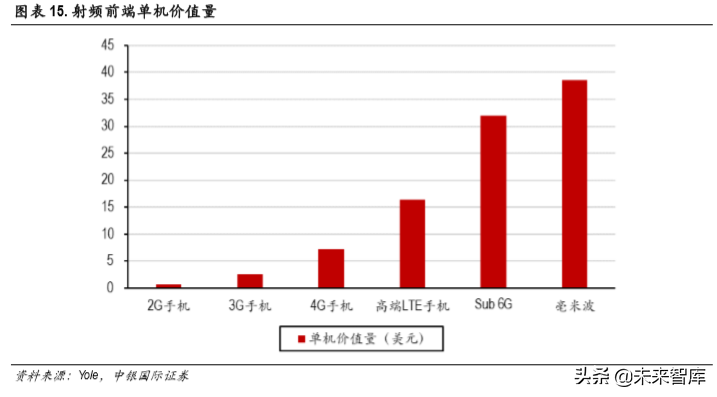 5G手机需要支持频段数量增加,带来射频前端价值量的提升。全网通的 5G手机至少需要新增 n77、 n79以及 n41三大频段,射频收发模块相应增加。根据 Yole数据,高端 4G手机的射频前端价值量约 16美金,而 Sub 6GHz智能手机射频前端价值量将达到 32美金,到毫米波时,智能手机的射频前端的 单机价值量将增至 38.5美金。