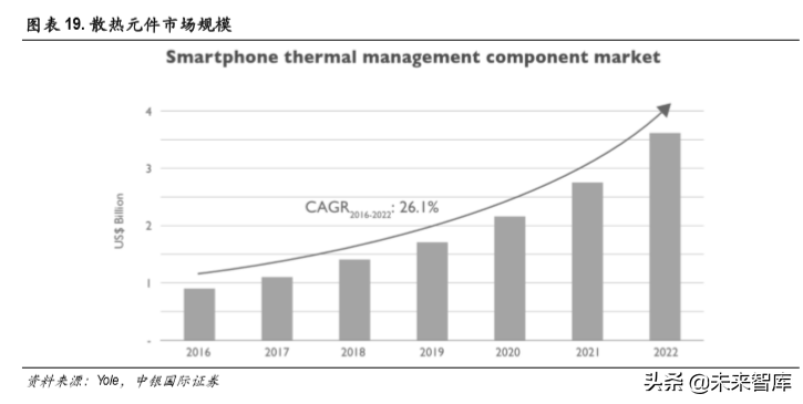 根据Yole预测,2022年手机散热组件市场规模将达到36亿美金以上,2016-2022年复合增速高达26.1%。