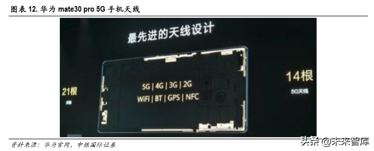 5G 通信,手机需要在支持之前所有通信频段的基础上,增加新的频段传输功能。5G 中的低频段 sub-6GHz由于和 4G通信波段 1-2.6GHz相差不大,因此天线的尺寸仍然会是厘米级,与 4G使用的天 线区别不会太大。但由于新频段的增加和 MIMO天线技术的使用,天线的数量会增加。华为 Mate 30 Pro 5G手机机身集成了 21根天线,包括 5/4/3/2G、WiFi、BT、GPS、NFC,其中,14根天线用于 5G连接。