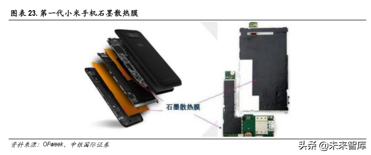 2011 年发布的第一代小米手机采用“大面积石墨散热”技术,利用两片石墨,一片将主板部分热量 传到背板,另一片则用来分散屏幕附近的热量,并采用金属板进一步分散整机热量。