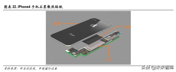 iPhone4是较早使用石墨贴纸散热的量产智能手机。 iPhone4 处理器 A4芯片性能和功耗相比前代有显 著提升。为了让 A4芯片稳定运行,苹果在背板上覆盖一层石墨散热贴纸,在芯片部分石墨层和芯片 屏蔽罩直接接触,将热量传递至整个玻璃背板。